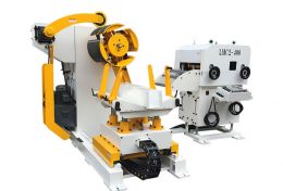 三合一送料机是结合了料卷架、上料台车、矫正机、NC送料机的功能,大大地缩小了以往送料装置所占的面积,且同时可配合冲床工作。装在料卷架上的料卷是由料卷下方的感测器所控制,利用NC送料机可一边整平,一边将预先设定好长度的材料同步送入冲床模具内。各辅助装置的运转是以油压、空压或电气做为动力源。料卷机采用悬臂式压料,马达传动控制,可正反转,及油压缸方式挟持铁圈,操作简单,保养容易,故障率低。矫正送料